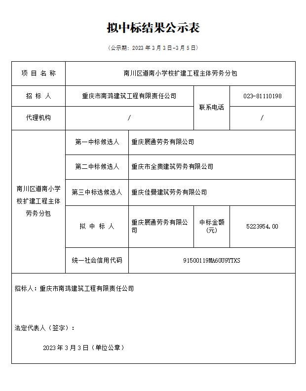点击下载附件:南川区道南小学校扩建����� �������Ƴ������������ �������Ƴ������������ �������Ƴ�������工程主体劳务分包中标结果公示 doc...