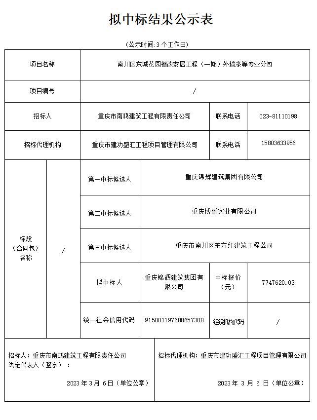 点击下载附件:南川区东城花园棚改安居工程(一期)����� �������Ƴ������������ �������Ƴ�������外墙漆等专业分包中标公示 doc..����� �������Ƴ������������ �������Ƴ�������.